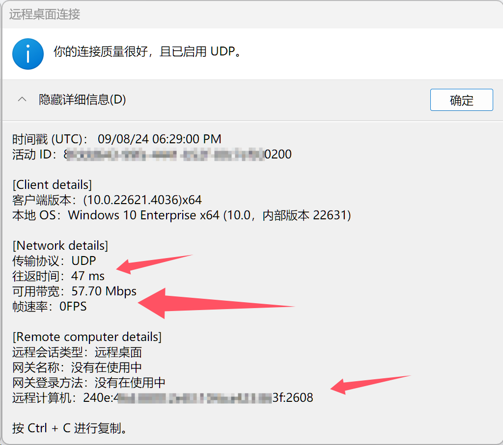 首先,可以发现的确是IPv6地址登录的,而且IPv6上UDP是开放的(至少我的运营商是开放的),往返时延也不低(47ms),带宽也挺大(57mbps,最高能到107mbps)。