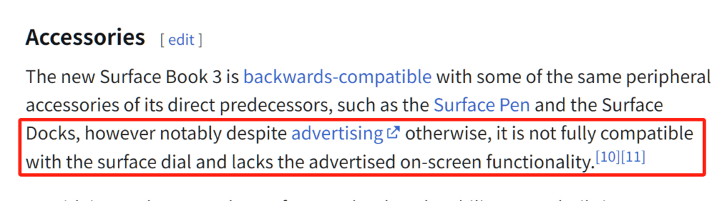 最近,我为了找一下相关资料,偶然进入了Surface Book 3的维基百科页面。可以看到,百科页面在外设章节详尽提及了Surface Book 3不践行承诺,放弃支持Surface Dial on-screen功能的这个事。