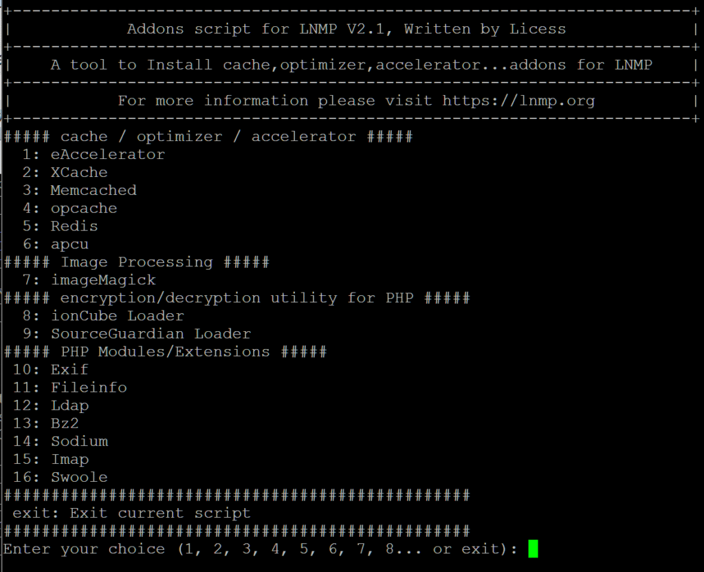 如果你是通过lnmp自动化脚本安装的建站环境,那php插件安装就比较蹊跷一些。你使用lnmp压缩包内的install.sh脚本安装整套环境以后,还需要并只能使用lnmp压缩包内的另一个脚本addons.sh脚本来安装可选的组件: