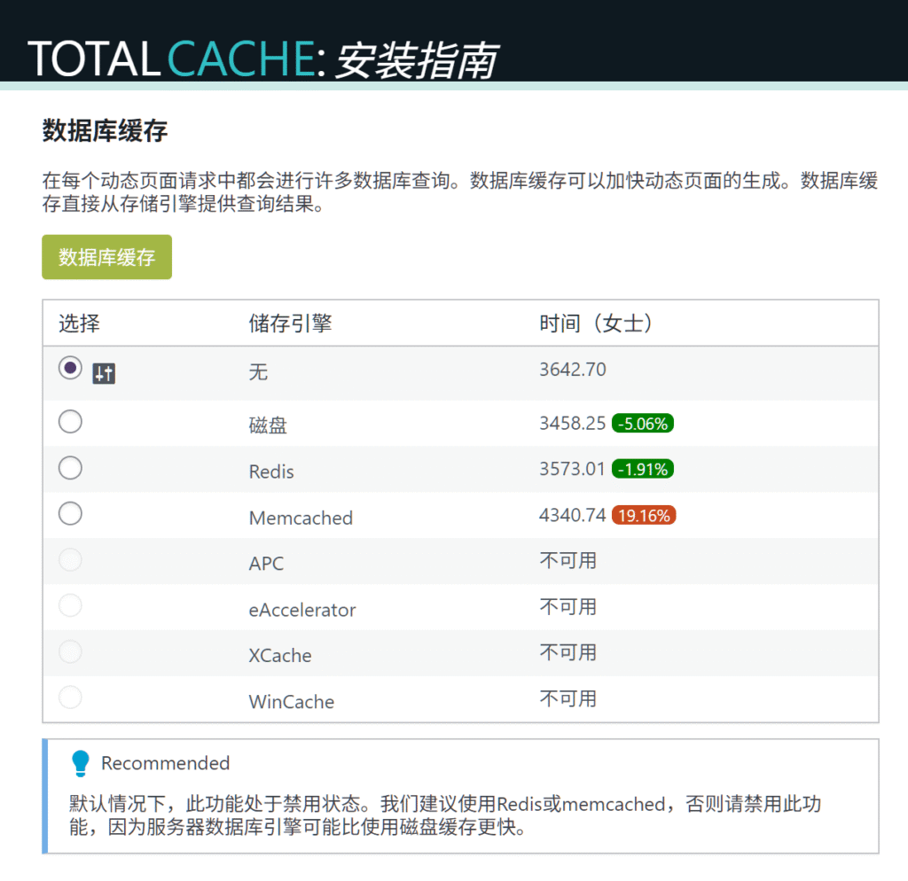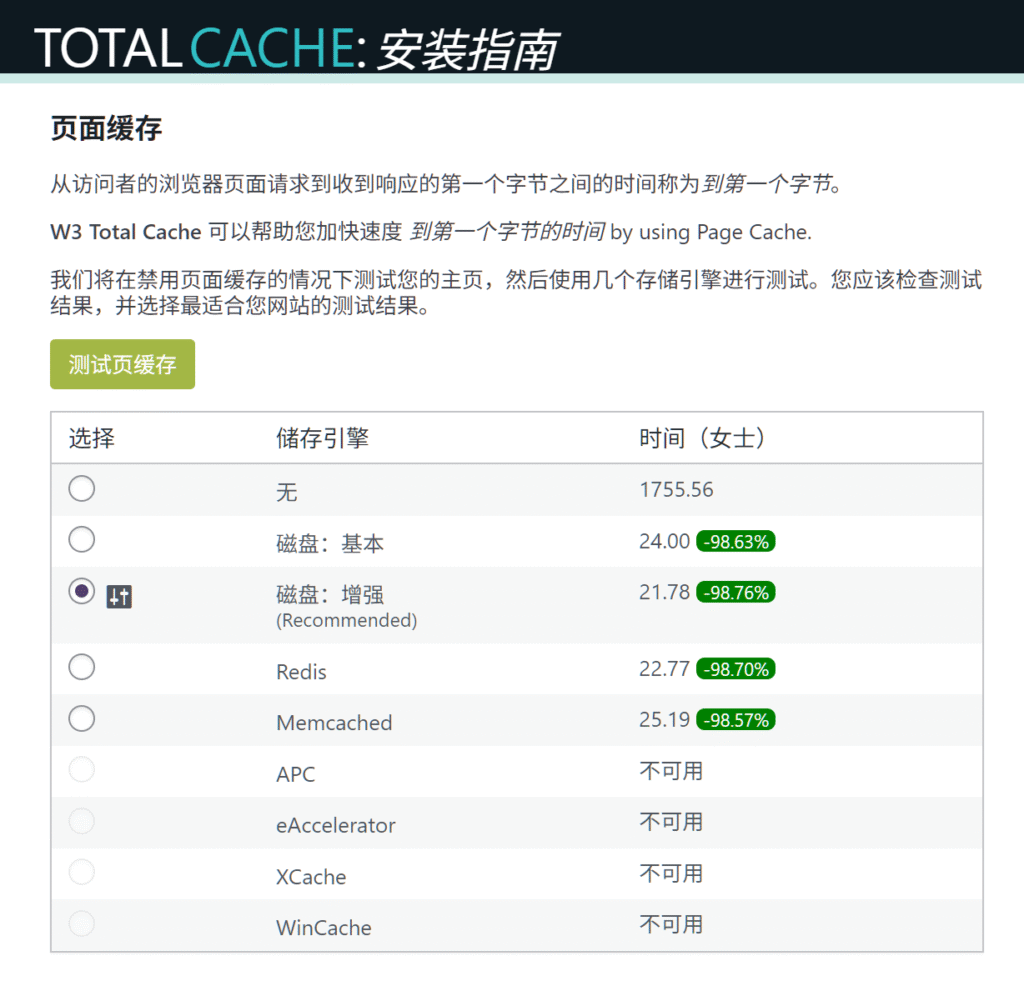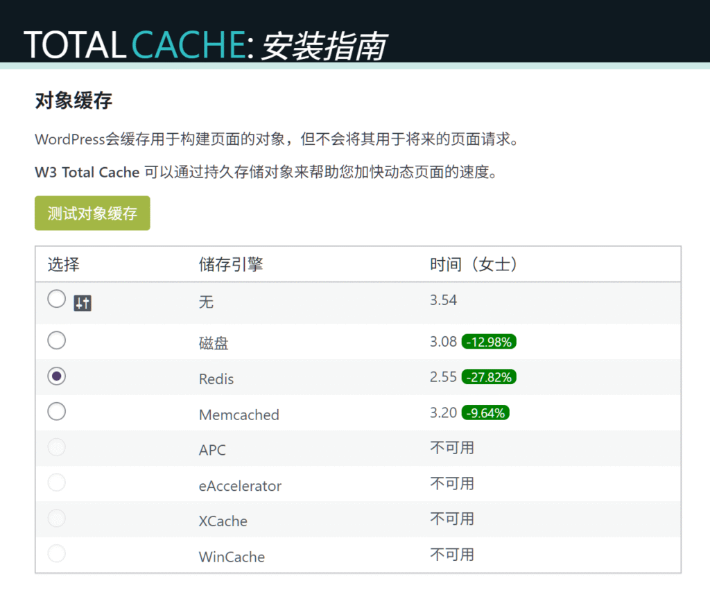 它和object cache引擎结合使用时效果最佳。Redis并不是唯一可使用的引擎,其它的Memcached、opcache等都有支持,但个人测试的结果,兼容性、功能和易用性综合最佳的是Redis。你可以在插件的“安装指南”引导页面对这些引擎进行测试,如下: