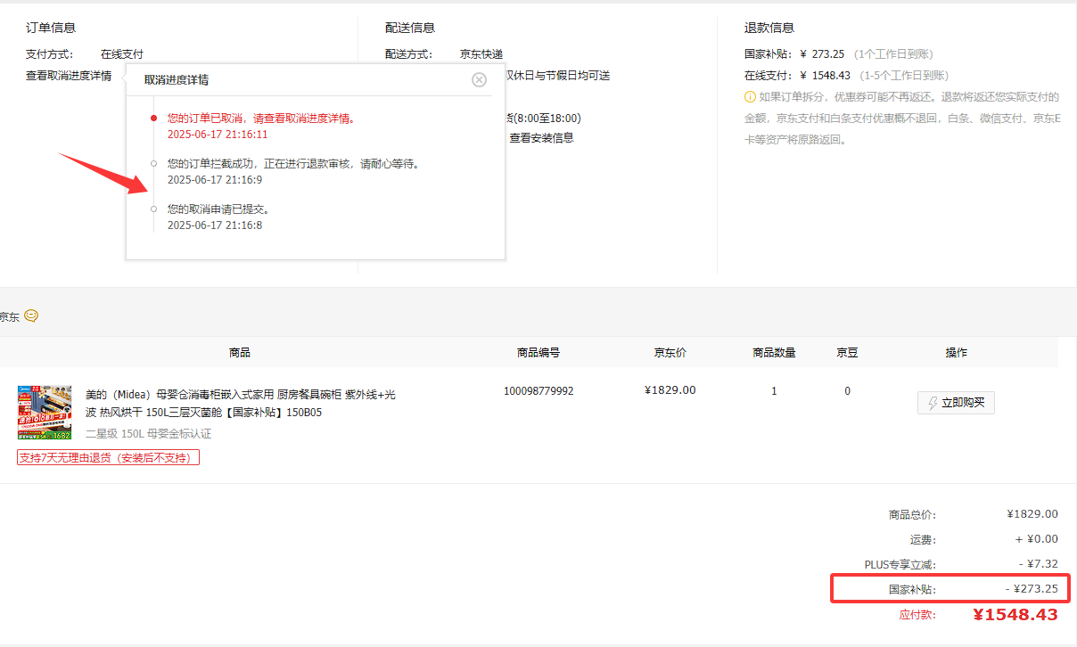 注意看,此时开始,“价保时应付”的“国家补贴”这一项悄咪咪变成了0!换言之,系统觉得我在申请价保时的这个时间点,我的这款消毒柜并不能享受国家补贴!
