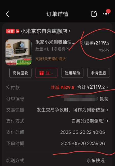 可以看到,6月17日计算价保时,系统是有在“价保时应付”的国家补贴一栏为我正常扣减国补的,并算得我申请价保之时应实付的价格为2015.28。作为对照,大家可以看到这个价保记录也认可我下单实付的价格是2119.20,这和我5月20日的订单详情能对得上。