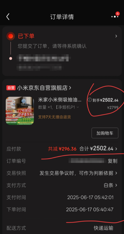 可以看到,现实是我并不能再次用国补资格来购买这款油烟机,我实际下单需要实付2502.64,而不是前述价保记录里面给我算出来的2015.28!这和我前面的价保详情根本就对不上!